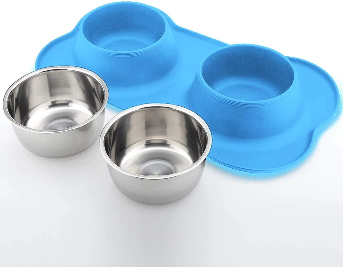 Waterproof Double Plate Stainless Steel Dog Bowl with Non-slip Pet Dog Mat