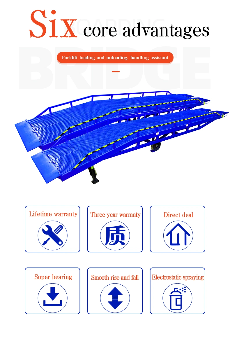The height of the yard ramp can be adjusted according to the height of the car compartment, and the forklift can directly enter the compartment through this equipment for bulk loading and unloading of goods. Only one person is required to perform rapid loading and unloading of goods. It enables enterprises to reduce a lot of labor, improve work efficiency, and obtain greater economic benefits.